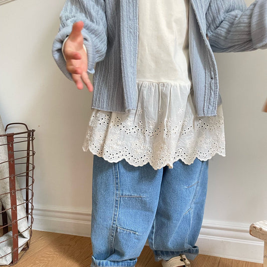 Toddler Milk SS25 Eyelet Lettuce-Edge Smocked Peplum Top and Wide Pants Set (1-7y) - 2 Colors