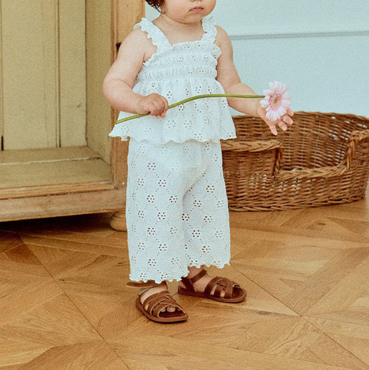 Toddler Milk SS25 Eyelet Lettuce-Edge Smocked Peplum Top and Wide Pants Set (1-7y) - 2 Colors