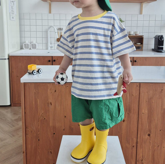 [At Noon Original Design] Kids Terry Cloth Stripe Short Sleeve Top and Shorts Set (6m-7y) - Yellow Blue
