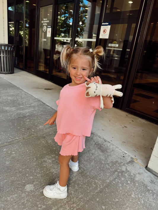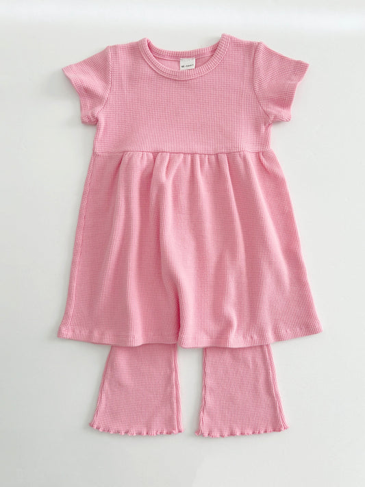 [At Noon Exclusive] Kids Waffle Lettuce-edge T-Shirt and Shorts Set (1-7y) - Pink