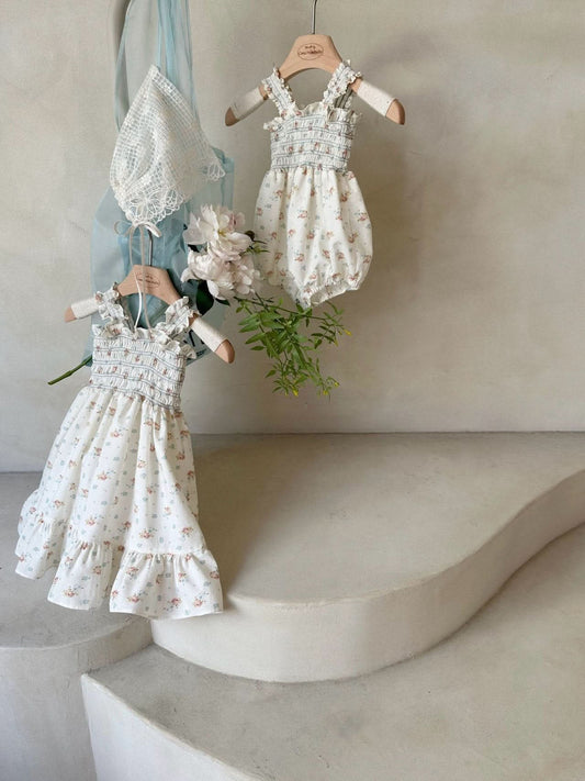 Baby Monbebe Floral Smocked Bodice Blue Stitch Romper (3-24m) - Floral Ivory