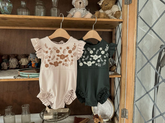 Toddler Susu Floral Embroidery Yoke Ruffle Sleeve One-Piece Swimsuit (1-6y) - 2 Colors