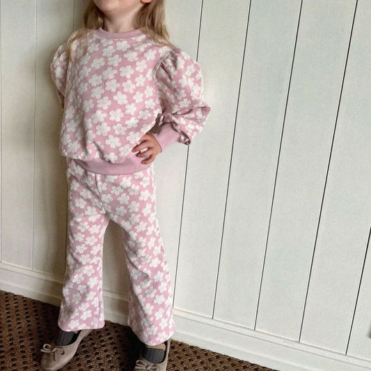 Kids Floral Jacquard Puff Sleeve Top & Pants Set (2-6y) - Pink