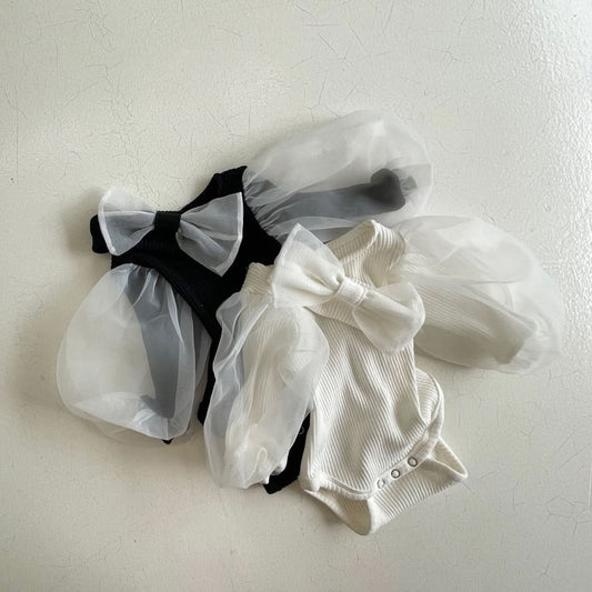 Baby Organza Puff Sleeve Rib Romper and Headband Set (3-24m) - Cream