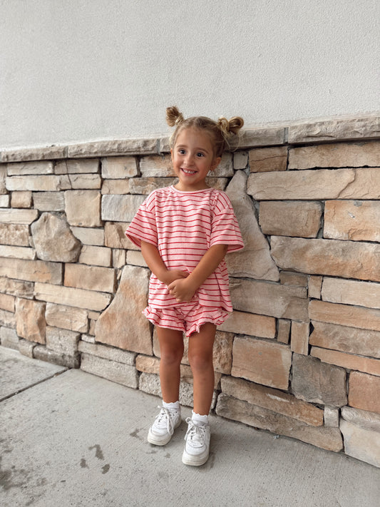 [At Noon Original Design] Kids Terry Cloth Stripe Short Sleeve Top and Ruffle Shorts Set (1-8y) - Pink
