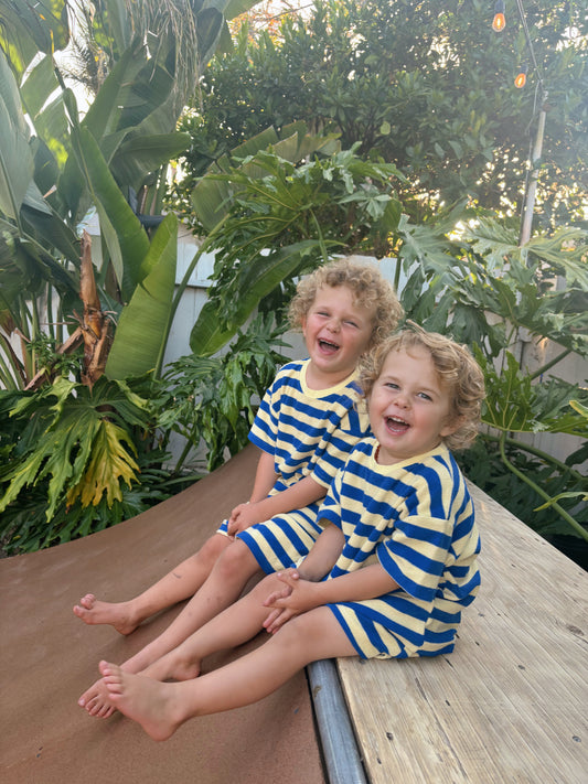 [At Noon Original Design] Kids Terry Cloth Stripe Short Sleeve Top and Shorts Set (6m-7y) - Yellow Blue