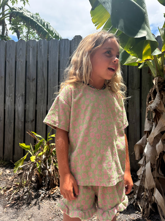 [At Noon Original Design] Kids Terry Cloth Floral Short Sleeve Top and Ruffle Shorts Set (1-8y) - Olive