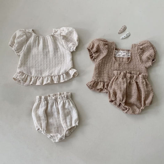 Baby BH Lace Detail Textured Puff Sleeve Top and Bloomer Shorts Set (3-18m) - 2 Colors