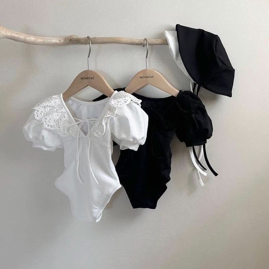 Girls Monbebe Tie Back Ruffle Collar One-Piece Swimsuit and Swim Hat Set (2-3y) - 2 Colors