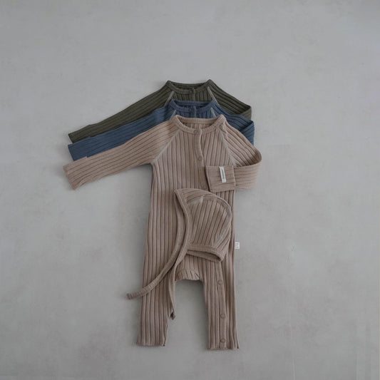 Baby Stitch Detail Ribbed Jumpsuit and Bonnet Set (0-3m)- Olive