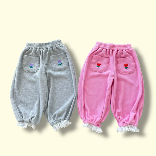 Toddler SP26 Tulip Embroidery Pocket Lace Trim Waffle Jogger Pants (3-7y) - 2 Colors