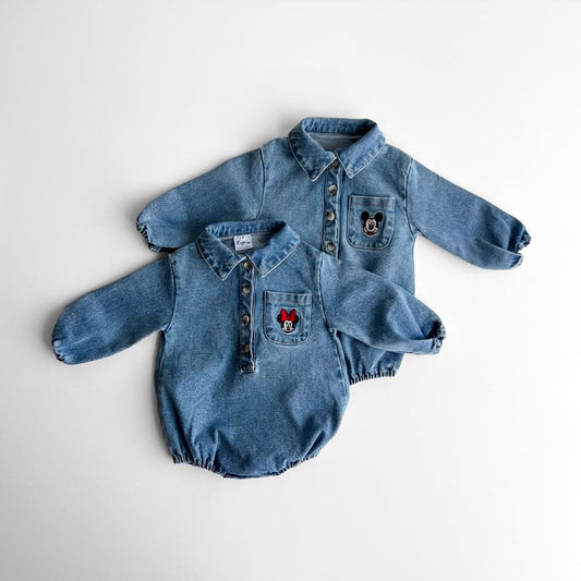 Toddler Disney Mickey and Minnie Face Embroidery Denim Long Sleeve Shirt Romper(6-18m) -2 Colors